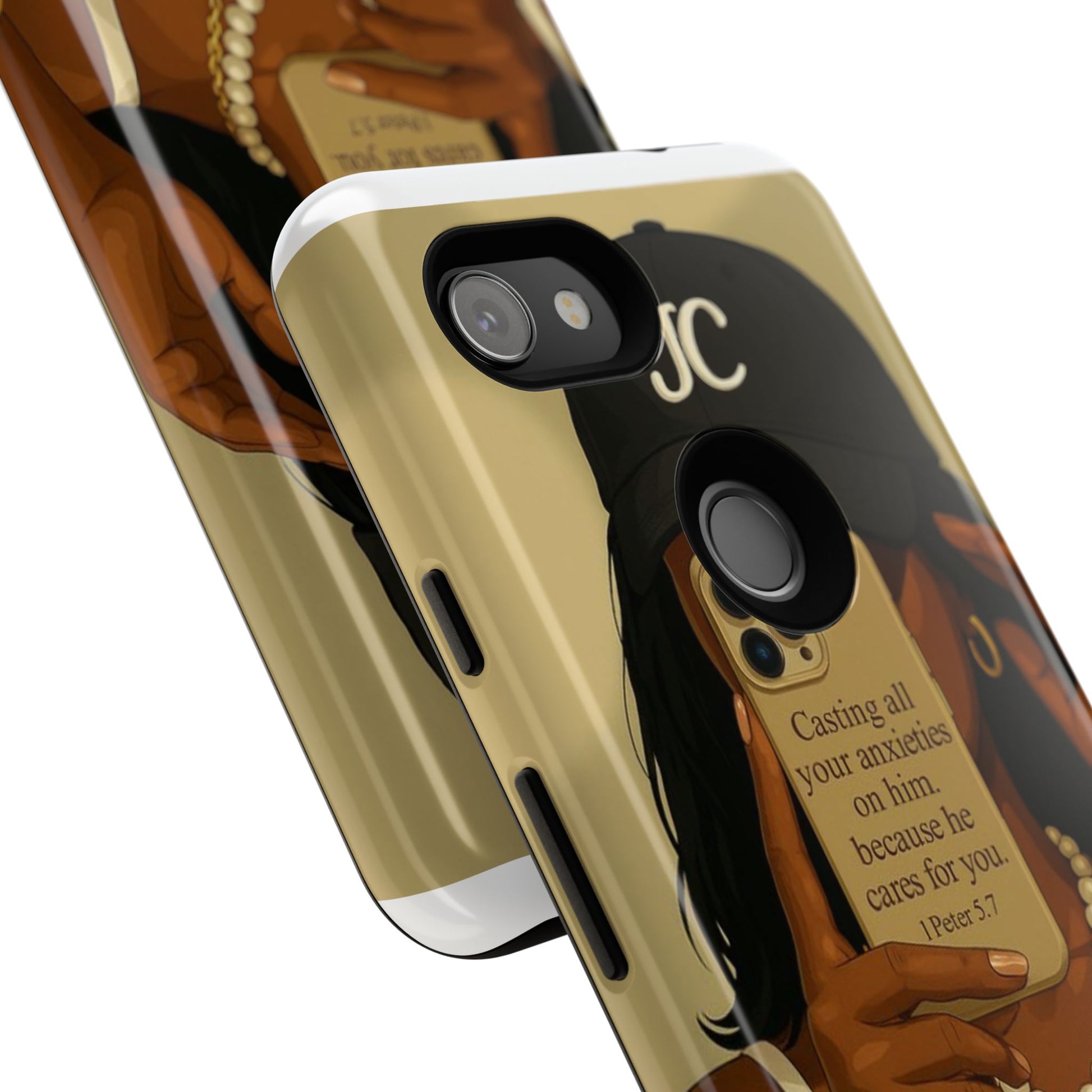 Featuring 1 Peter 5:7 “Cast all your anxieties on Him, because He cares for you” this design blends modern confidence with deep trust in Christ. Gold accessories, pearls, and “JC” cap details bring personality and purpose together.