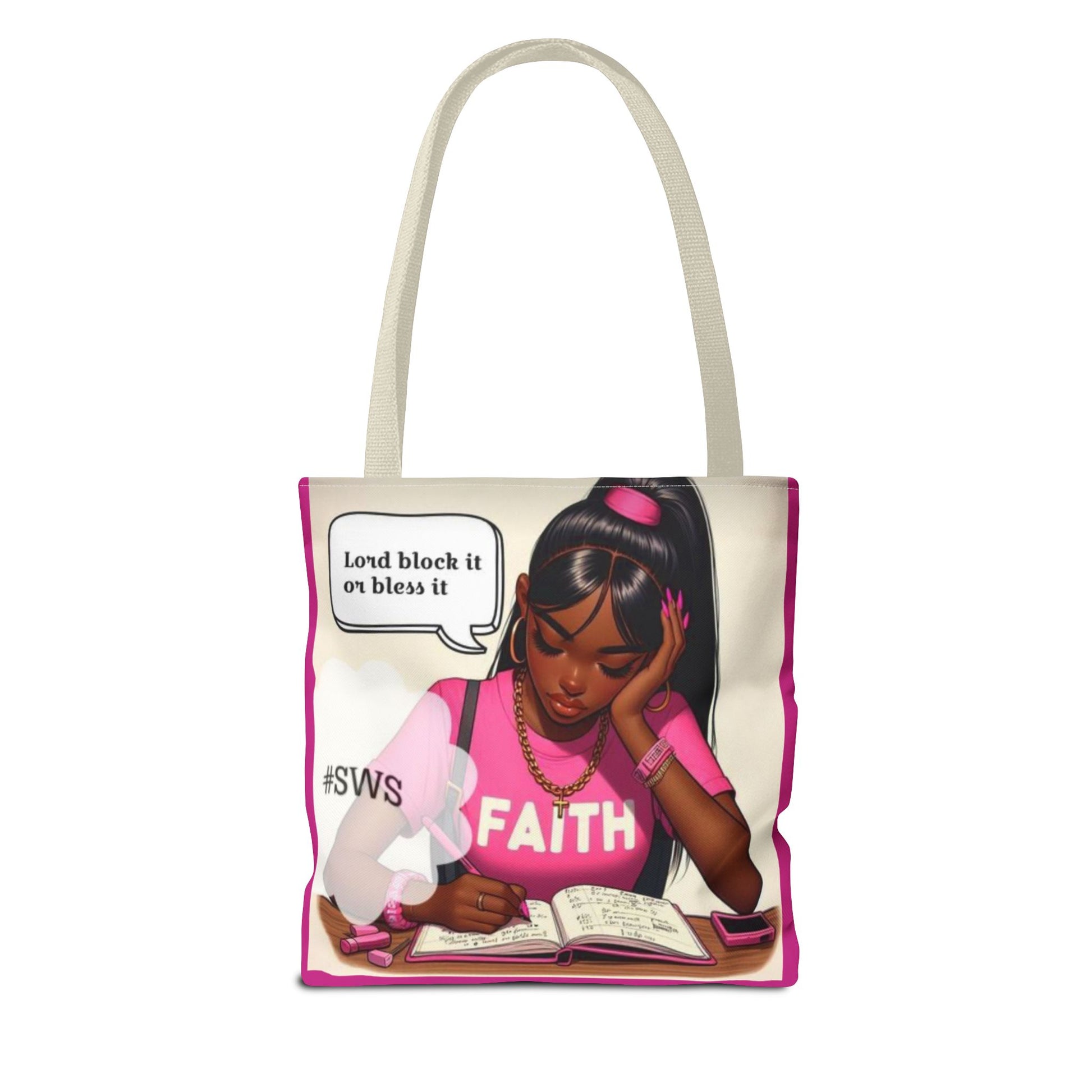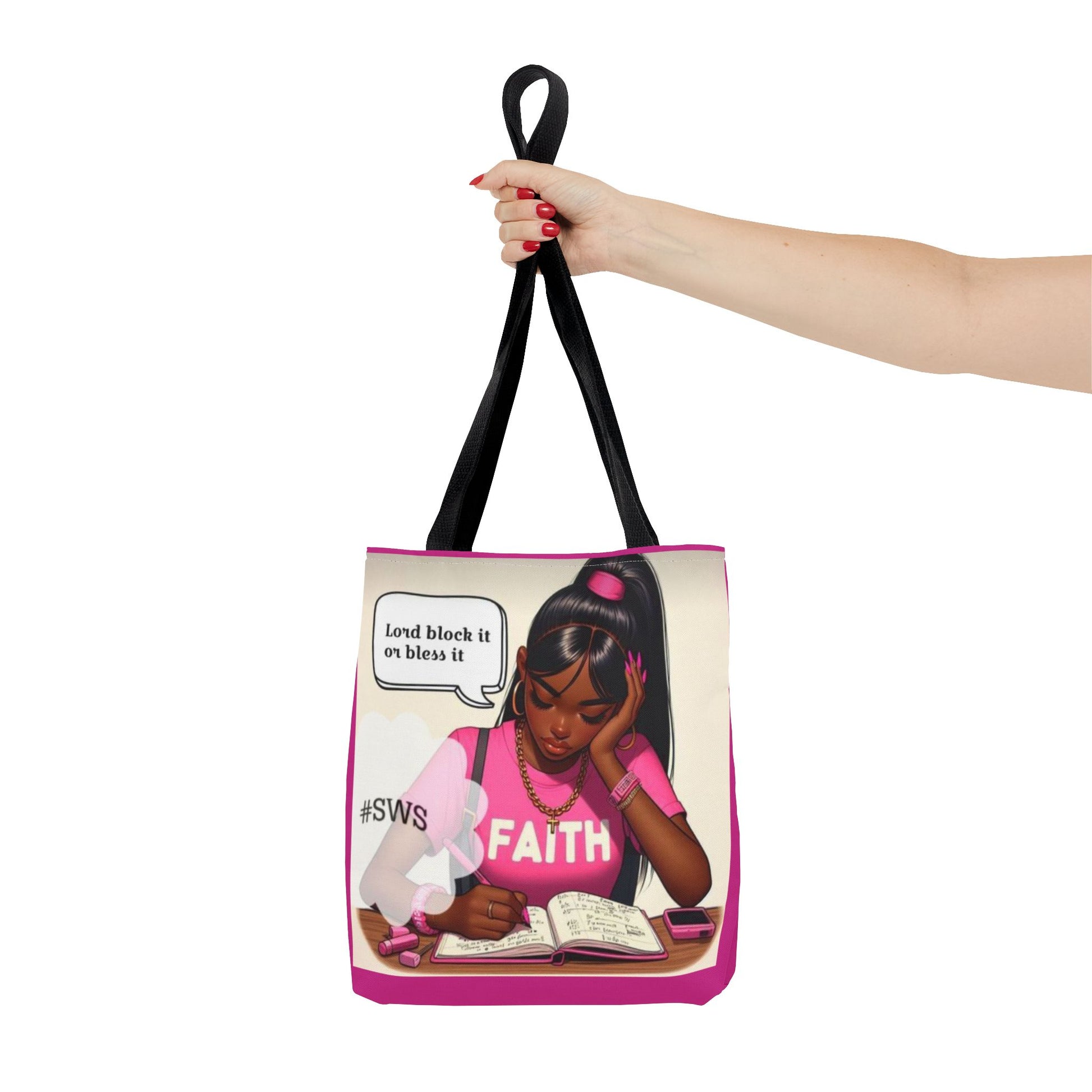 Featuring a faith-filled woman journaling her prayers and wearing her crown confidently, this bold tote reads: “Lord, block it or bless it.” It’s the perfect carryall for devotion days, Bible study, or when you’re out making moves but still letting God lead.