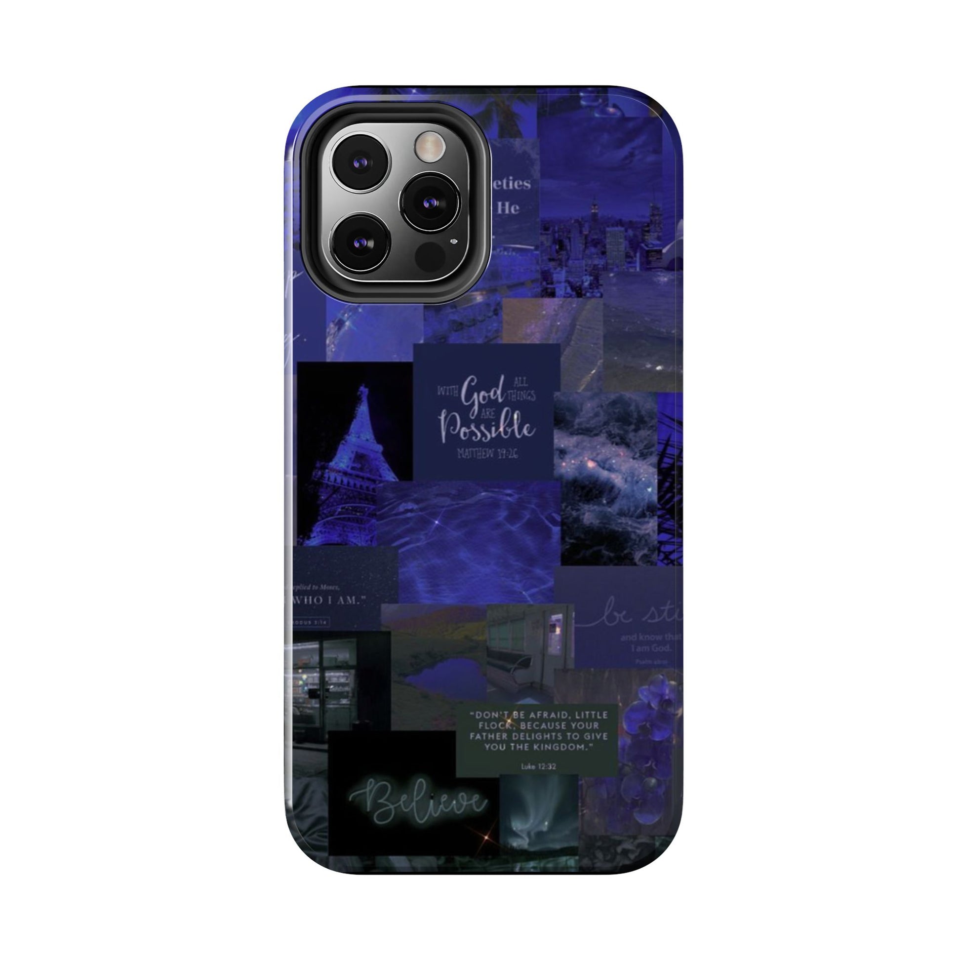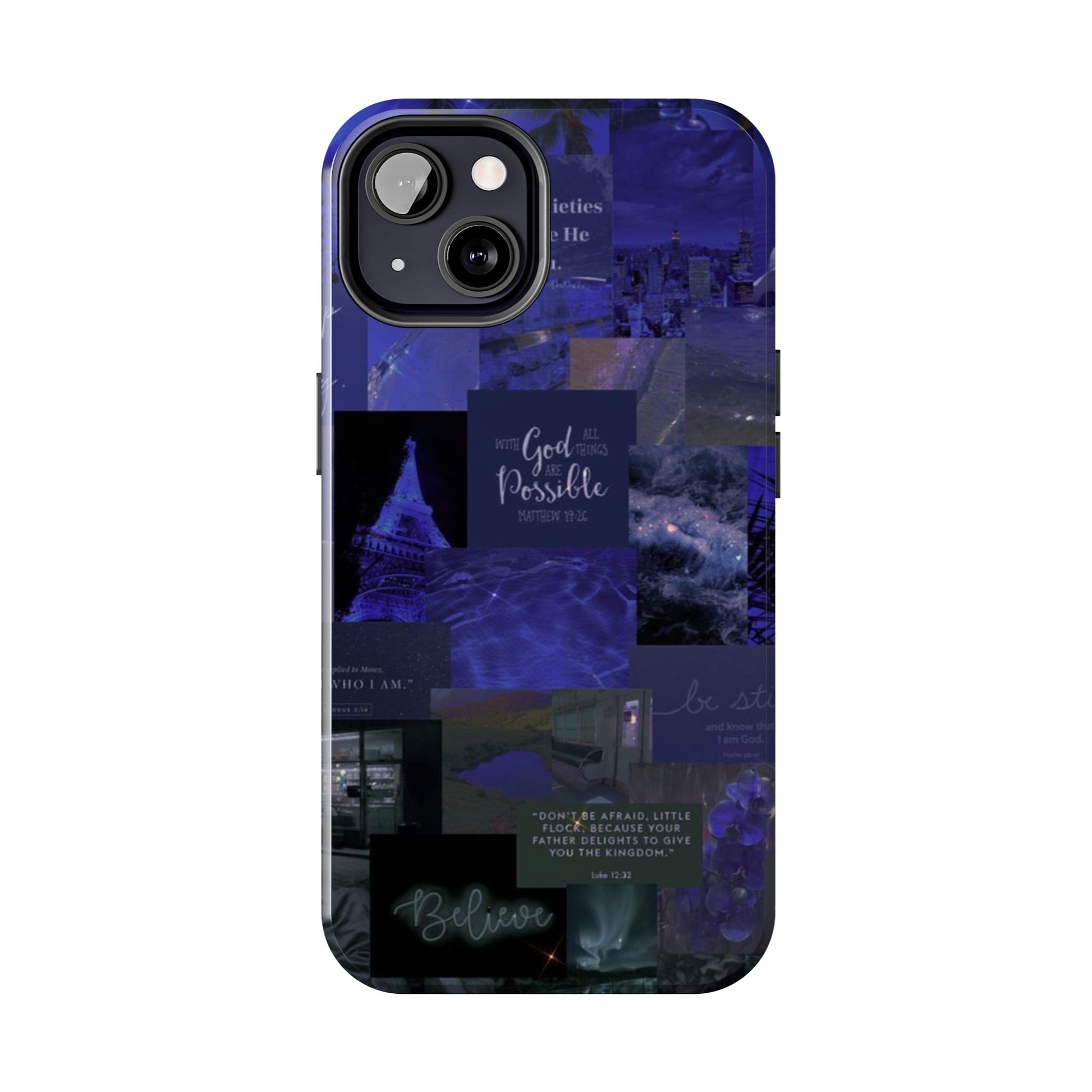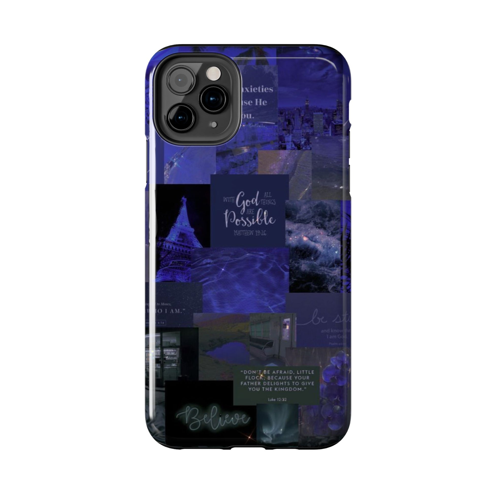 This deep blue collage-style case blends scripture, inspiration, and aesthetic beauty for the woman walking by faith not fear. Every glance reminds you to be still, believe, and trust that with God, all things are possible.