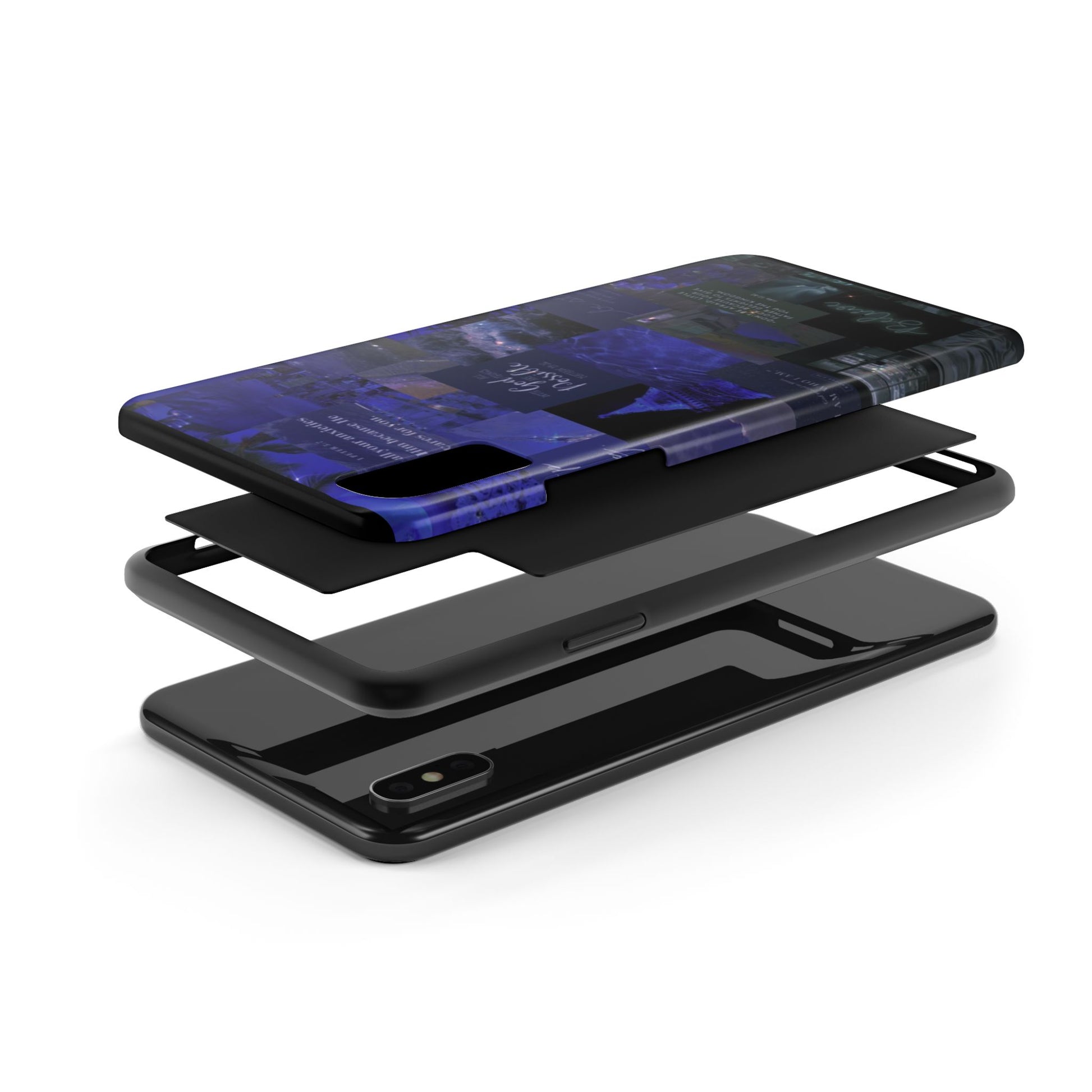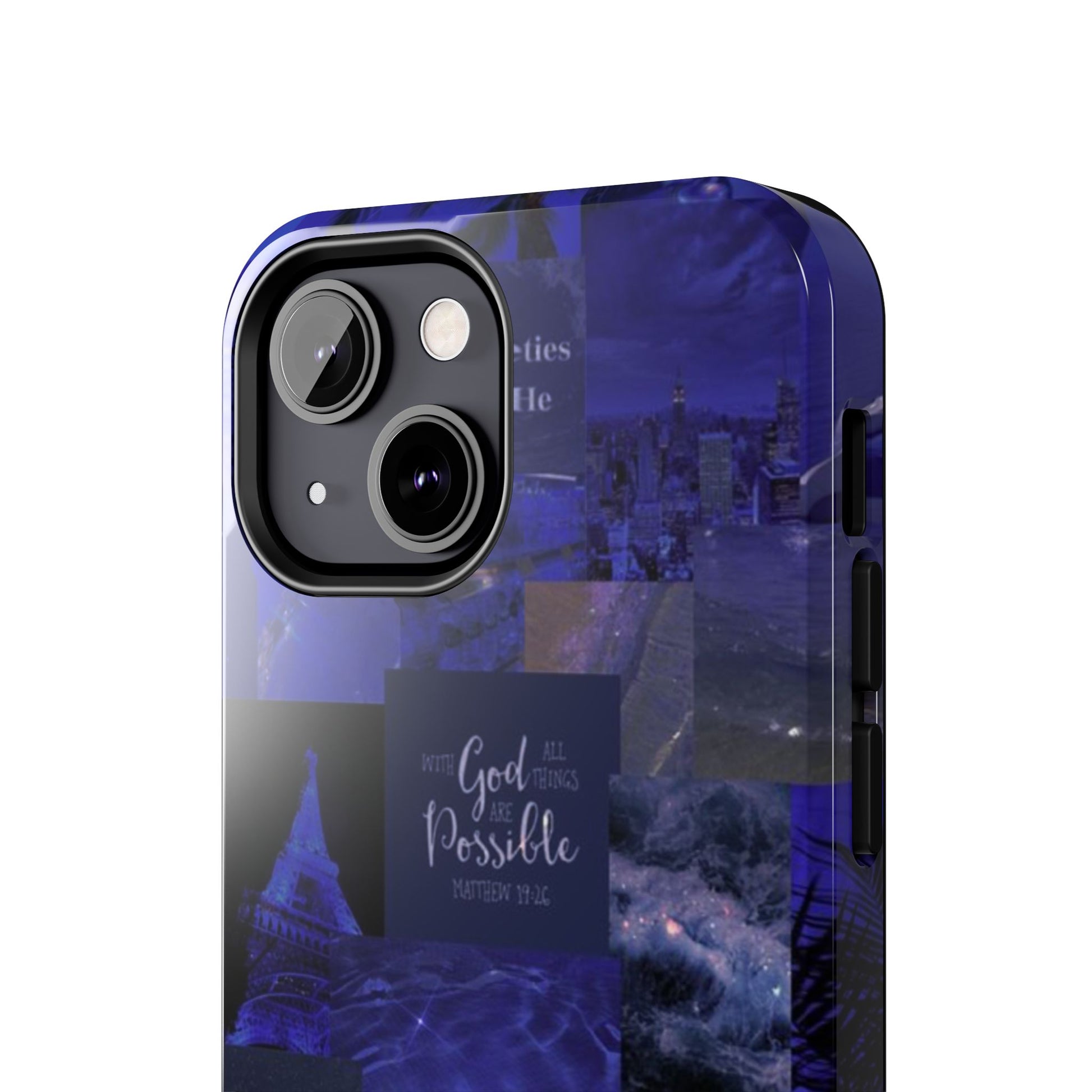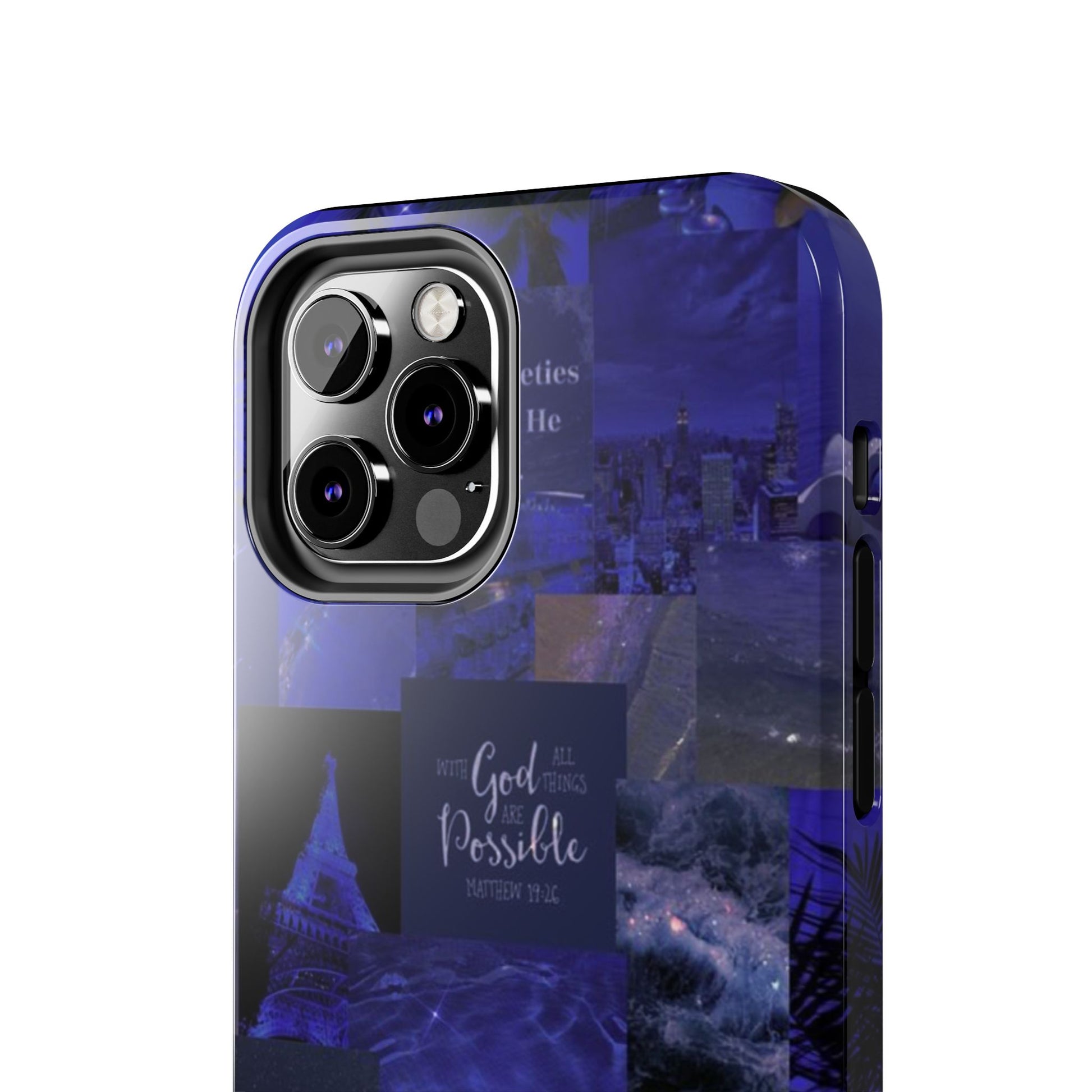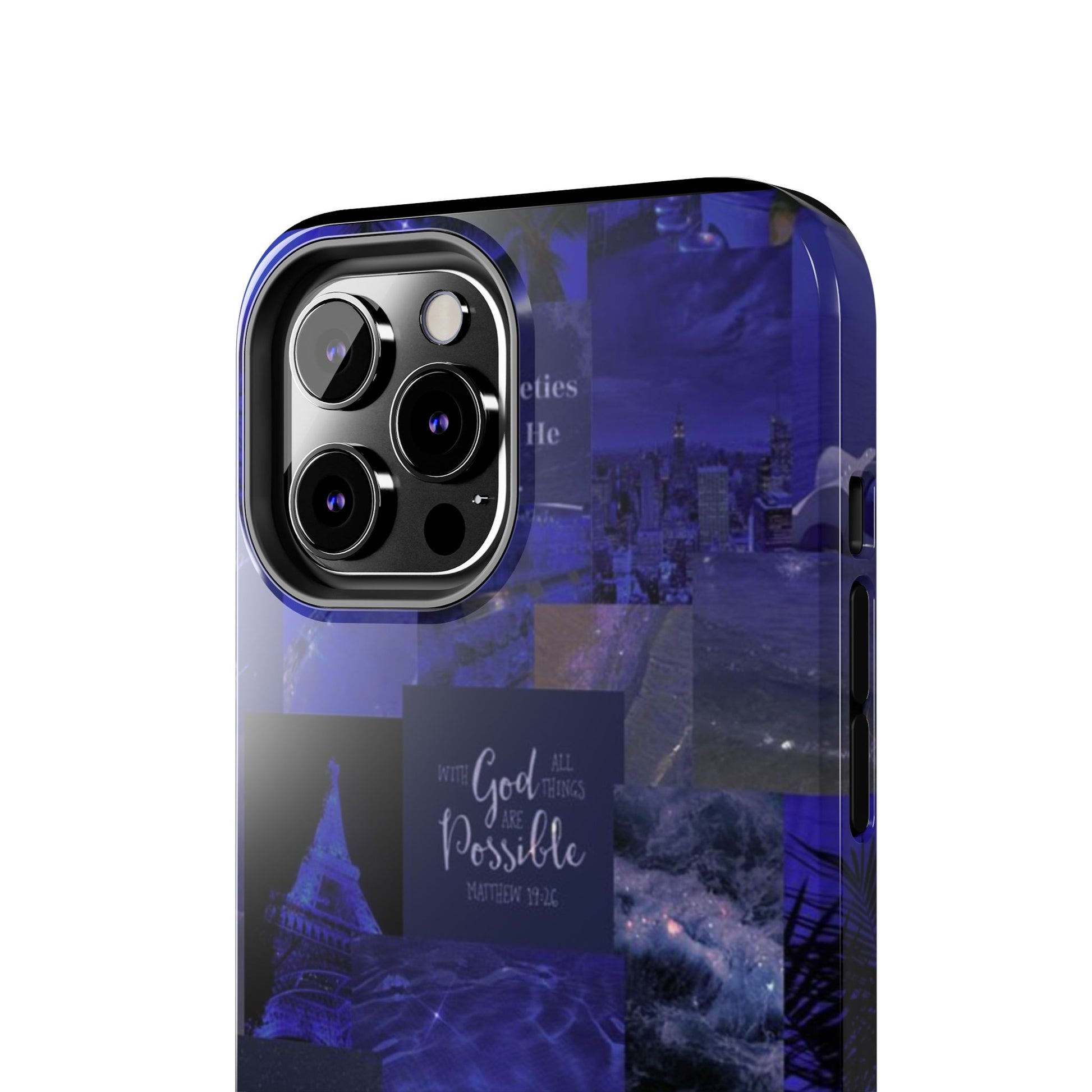 This deep blue collage-style case blends scripture, inspiration, and aesthetic beauty for the woman walking by faith not fear. Every glance reminds you to be still, believe, and trust that with God, all things are possible.