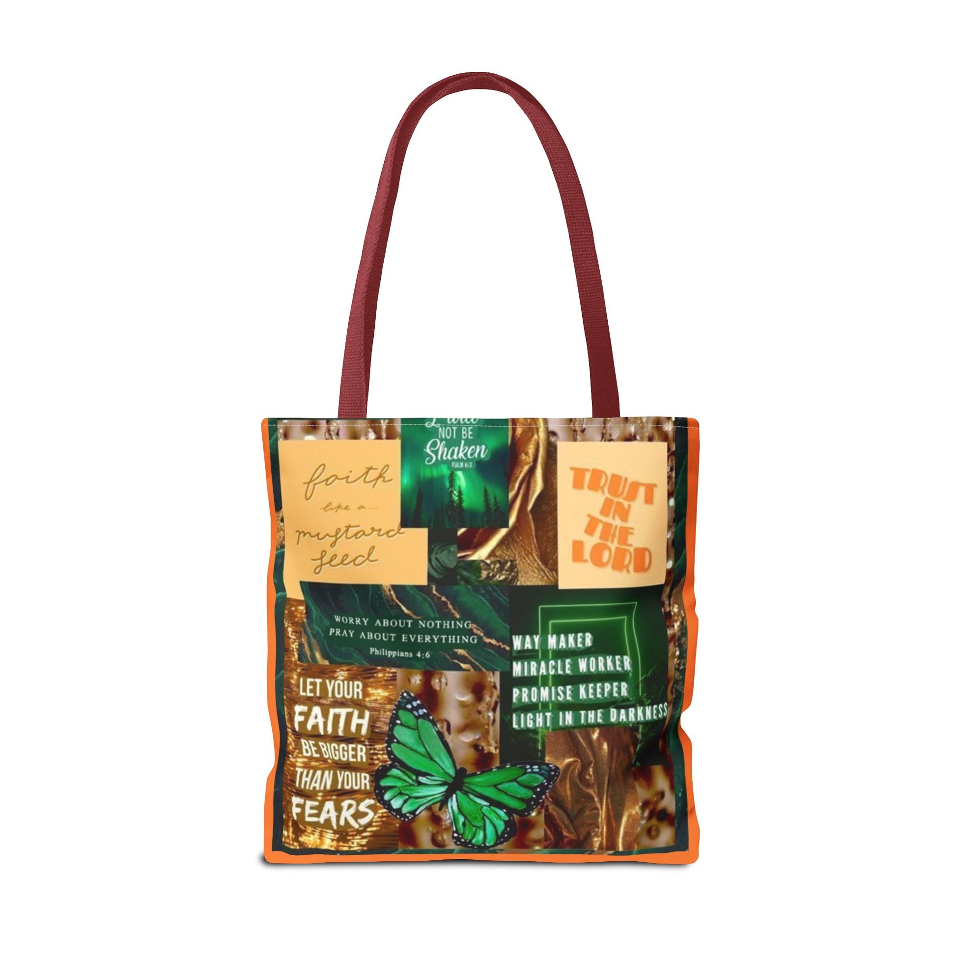 Walk boldly in faith with this vibrant tote that declares what you believe. Covered in life giving scriptures and reminders like “Let your faith be bigger than your fears” and “Trust in the Lord,” this bold green-and-orange collage tote is your go-to bag for everyday strength and spiritual confidence.