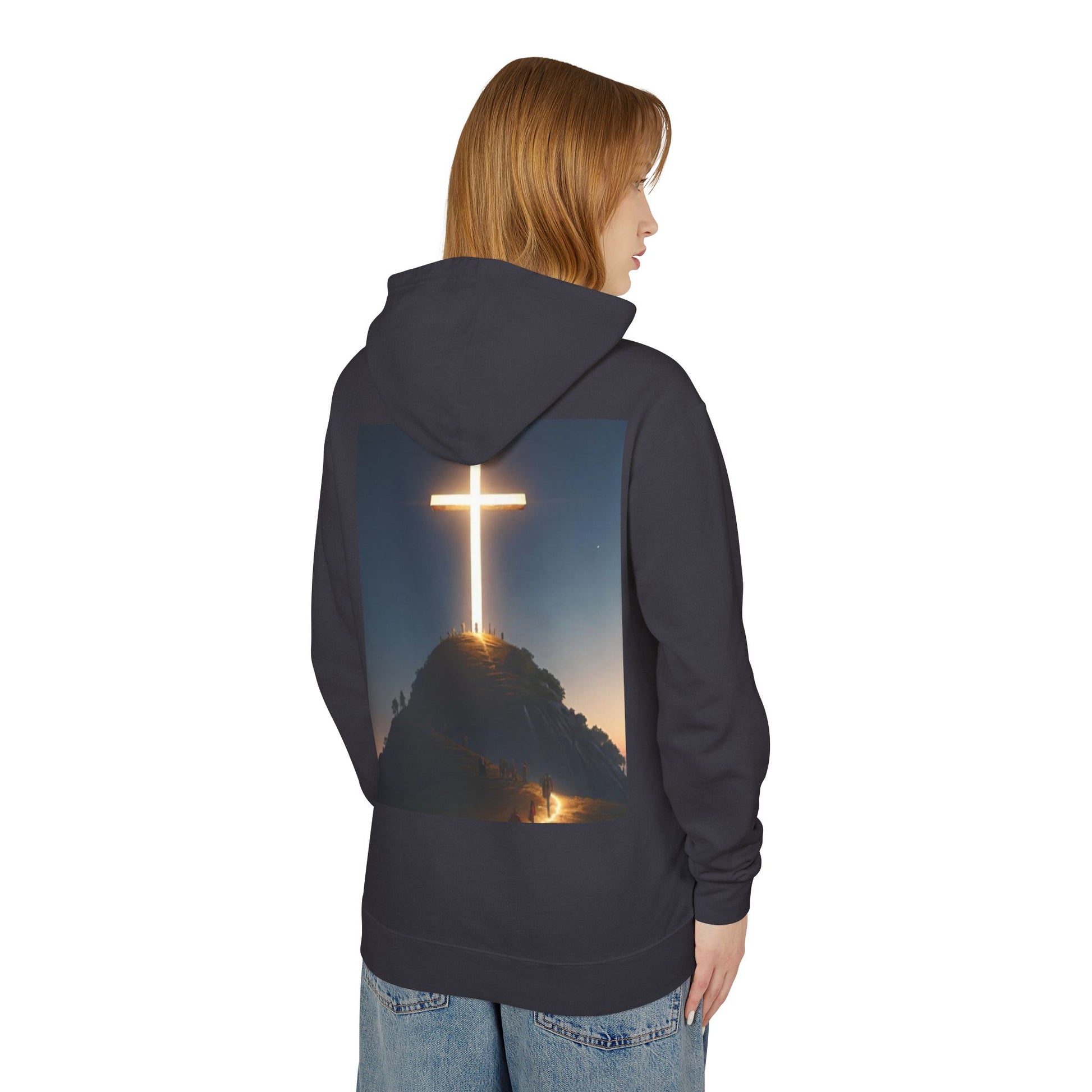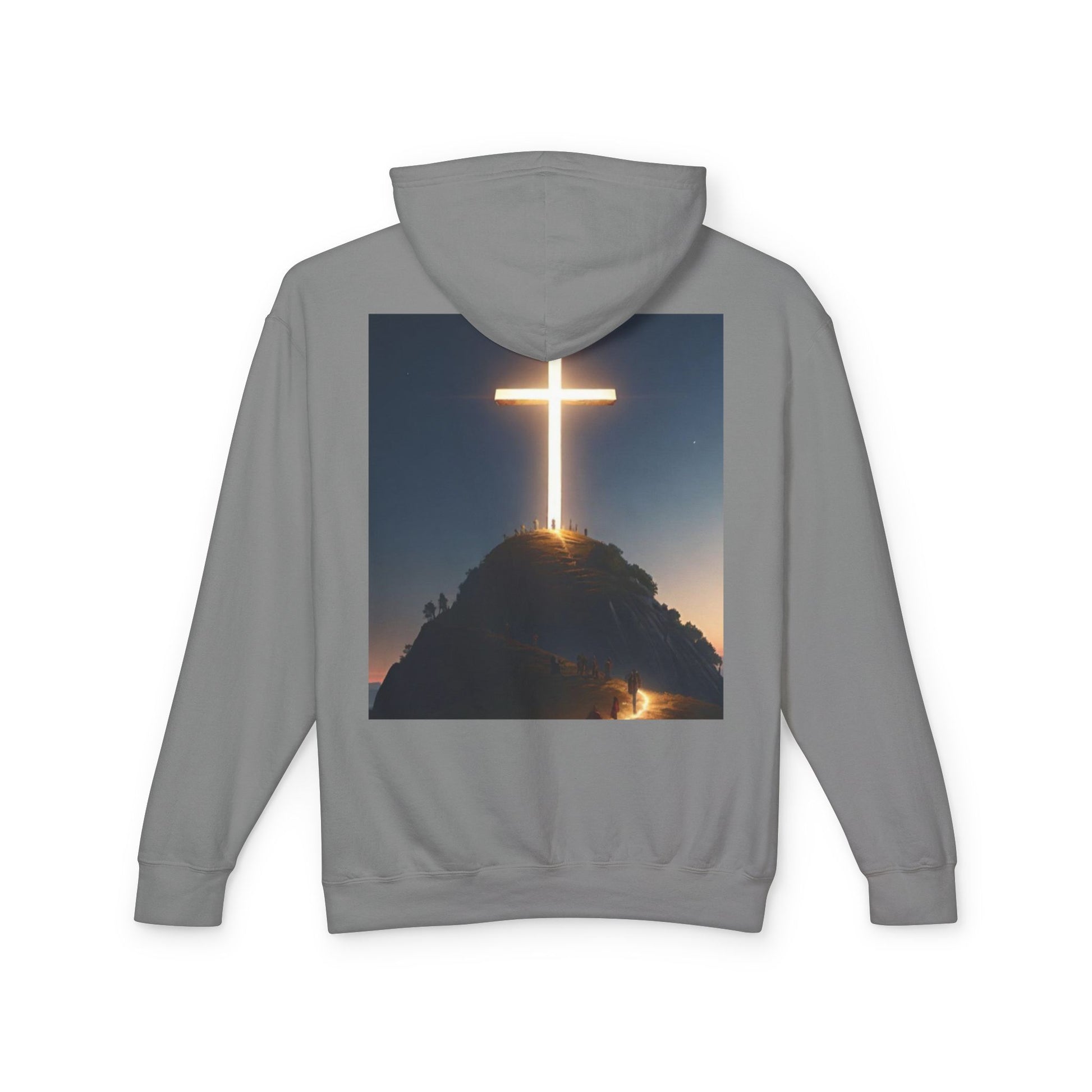 Put your faith on display with the “God First” hoodie a bold yet minimal reminder of what matters most. This white hoodie features clean front text and a stunning back design: a glowing cross shining over a mountain, symbolizing strength, direction, and divine protection. Whether you’re heading out or staying cozy, this hoodie speaks volumes without saying a word.