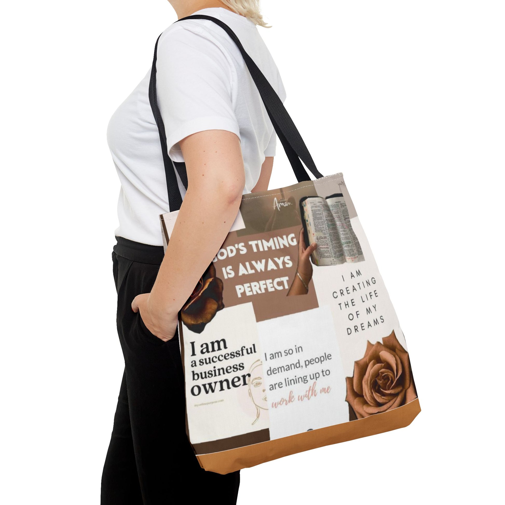 Elevate your daily routine with this stylish and versatile tote bag. Crafted from 100% polyester, it offers durability while retaining its shape, making it perfect for everyday use. The eye-catching design inspires motivation and positivity, adding a touch of uplifting energy to your day. Ideal for busy professionals, students, or anyone on-the-go, this tote seamlessly blends functionality with charm. It's great for various occasions like shopping trips, beach outings, or gym visits, and makes a thoughtful gift for celebrations such as birthdays or holidays. Carry your essentials in style and let this tote bag remind you that 'God's timing is always perfect.'