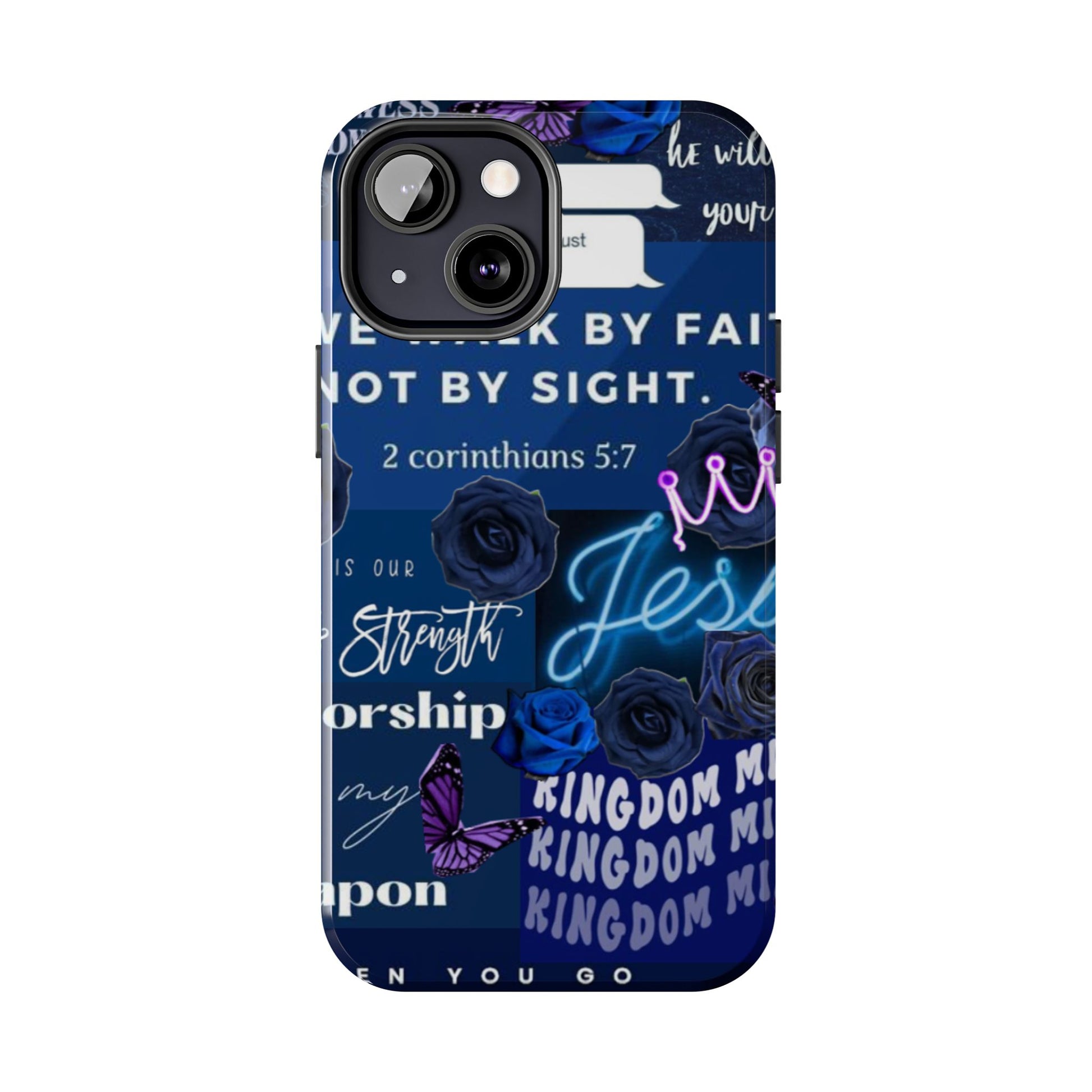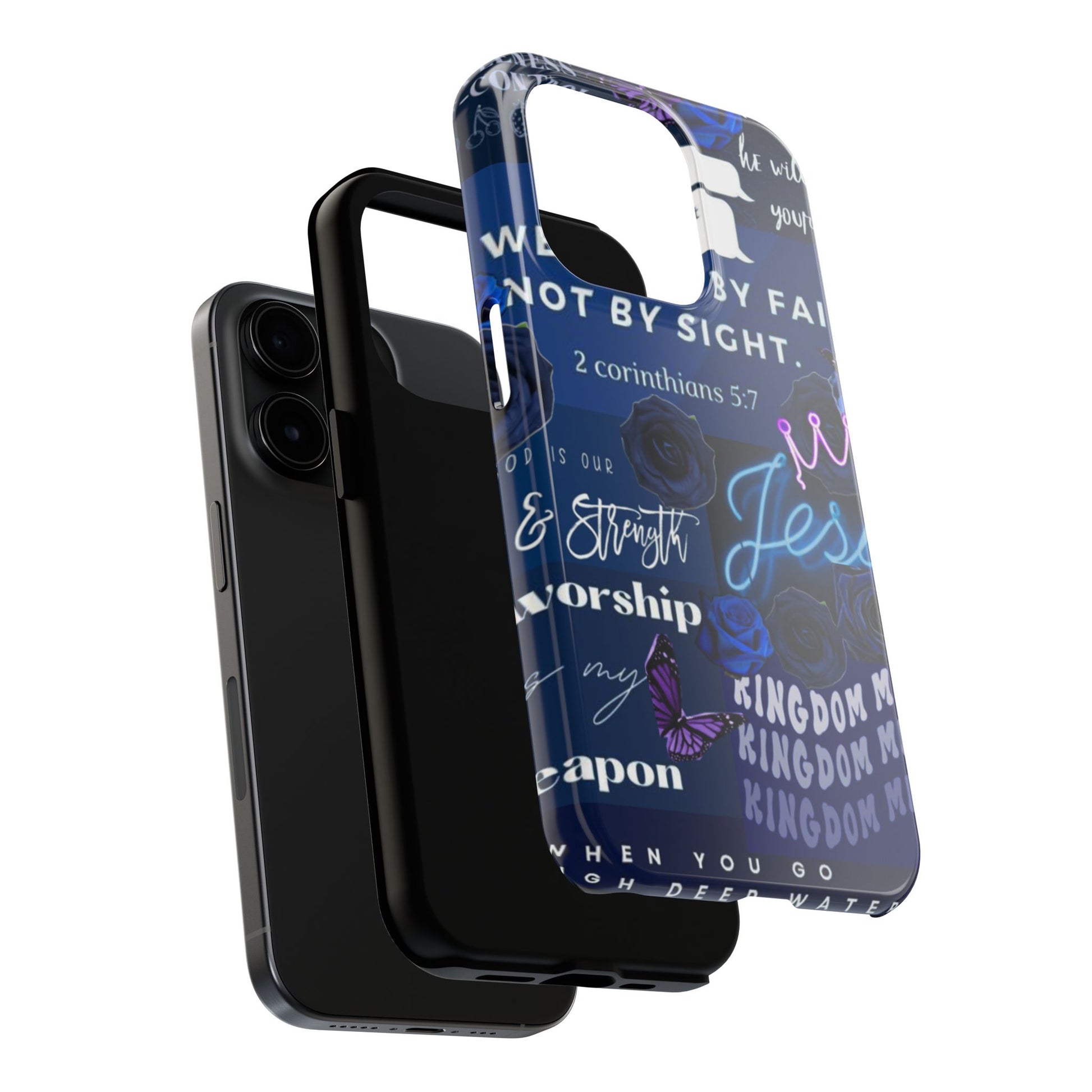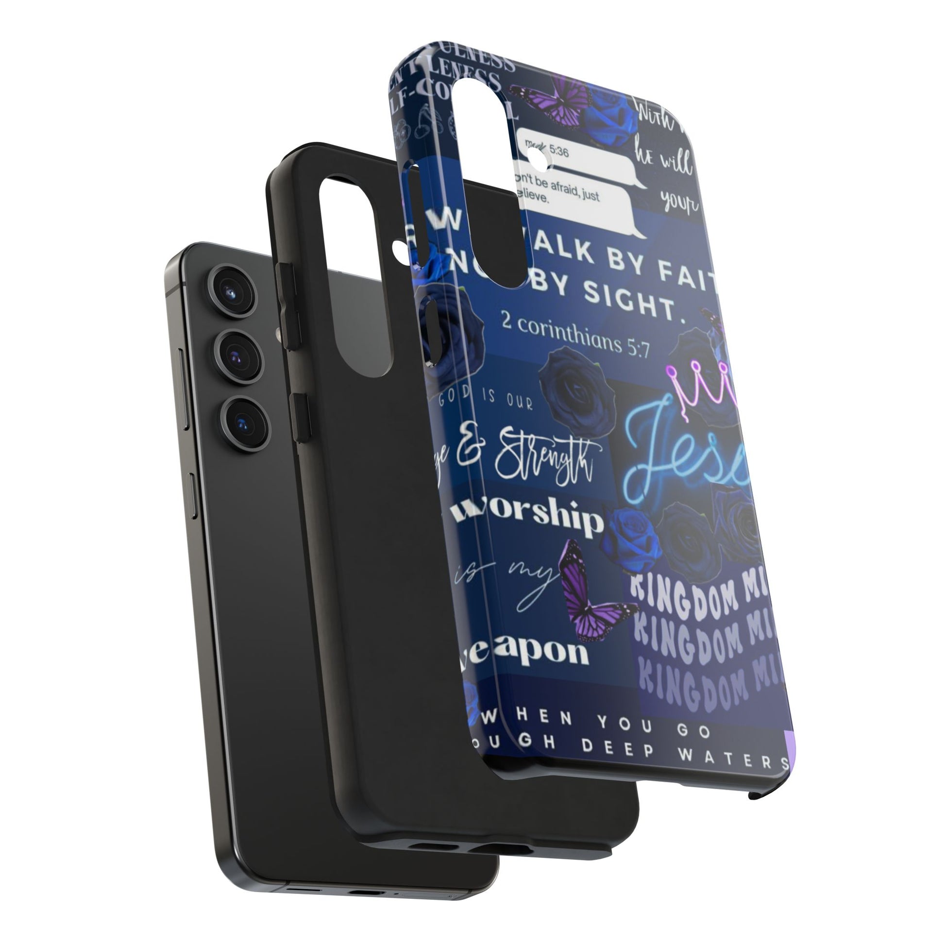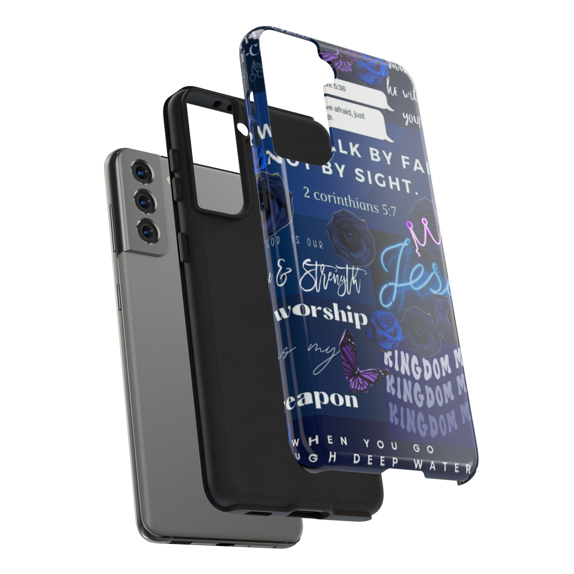 This phone case is for the Kingdom woman who fights her battles in worship and walks by faith, not by sight. Designed in rich navy blues with striking purple accents and royal roses, this collage style case features declarations like: