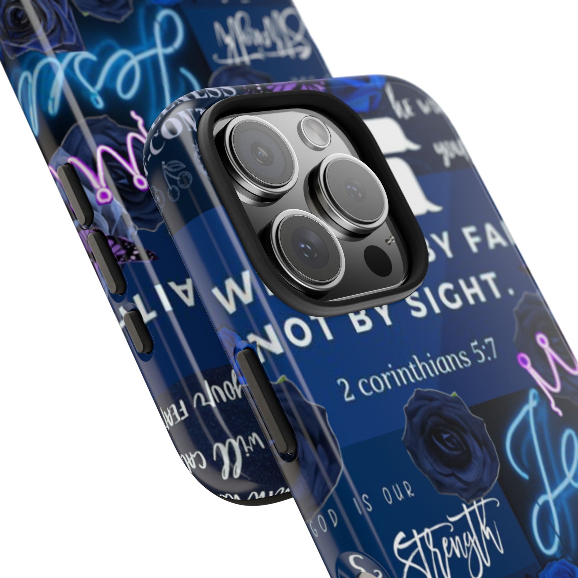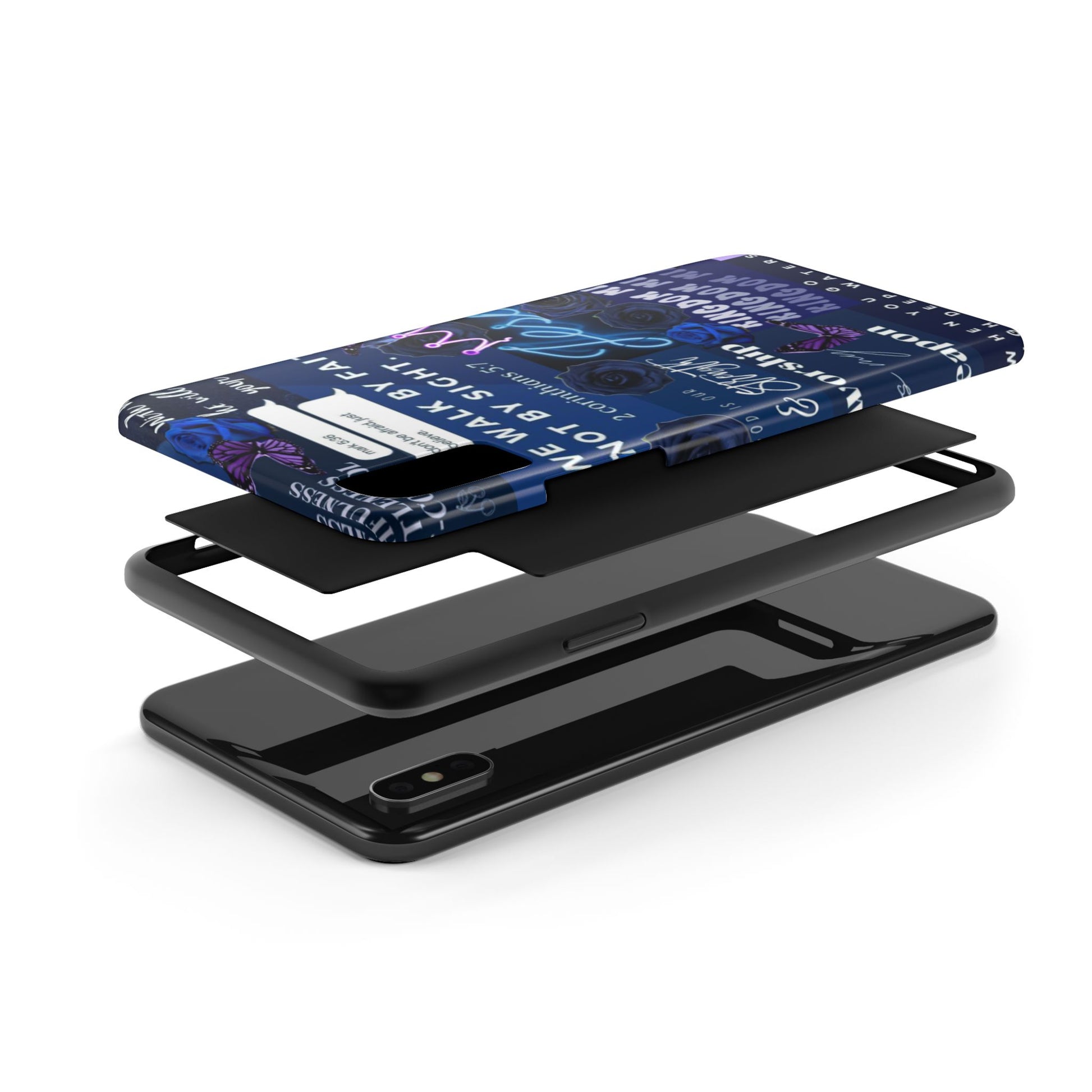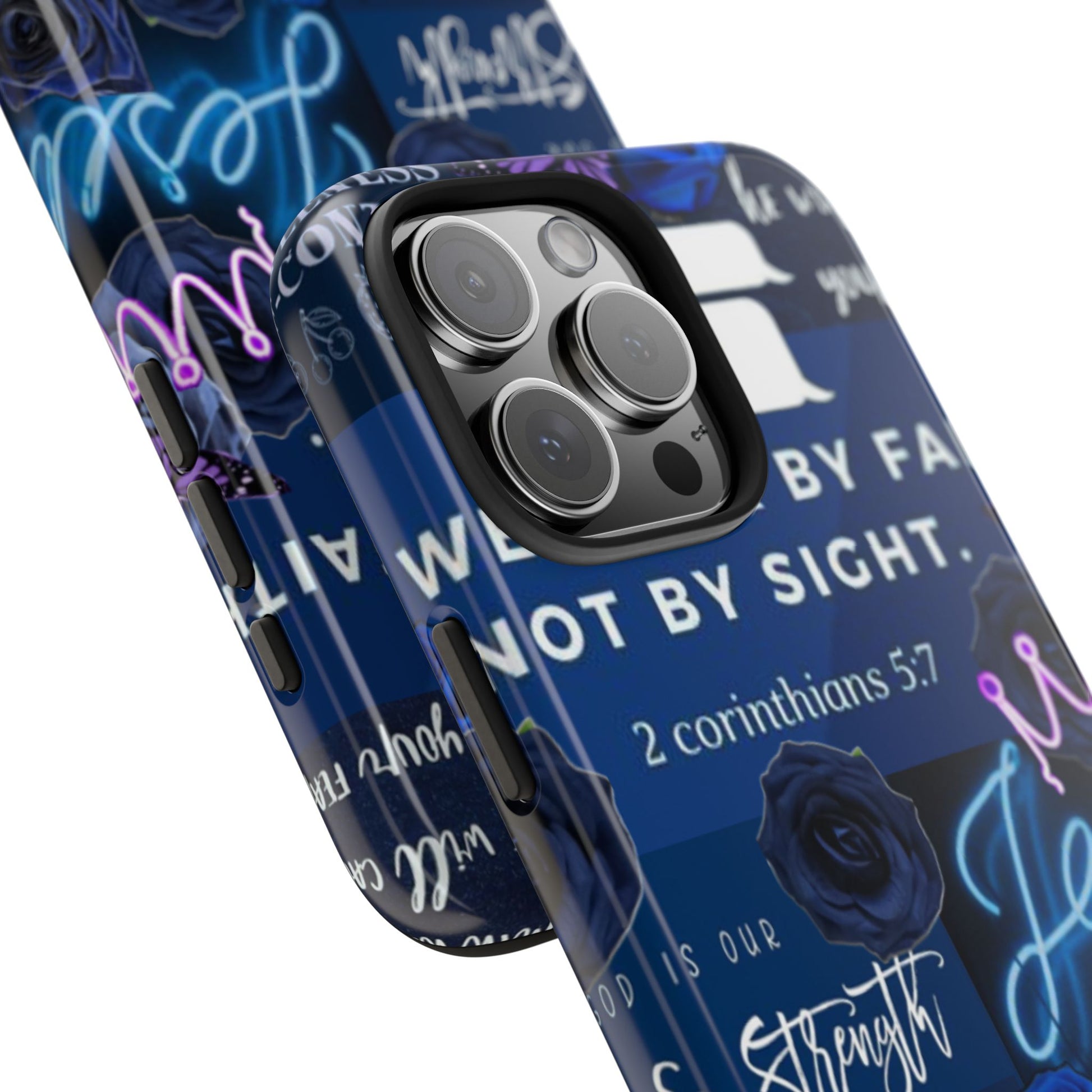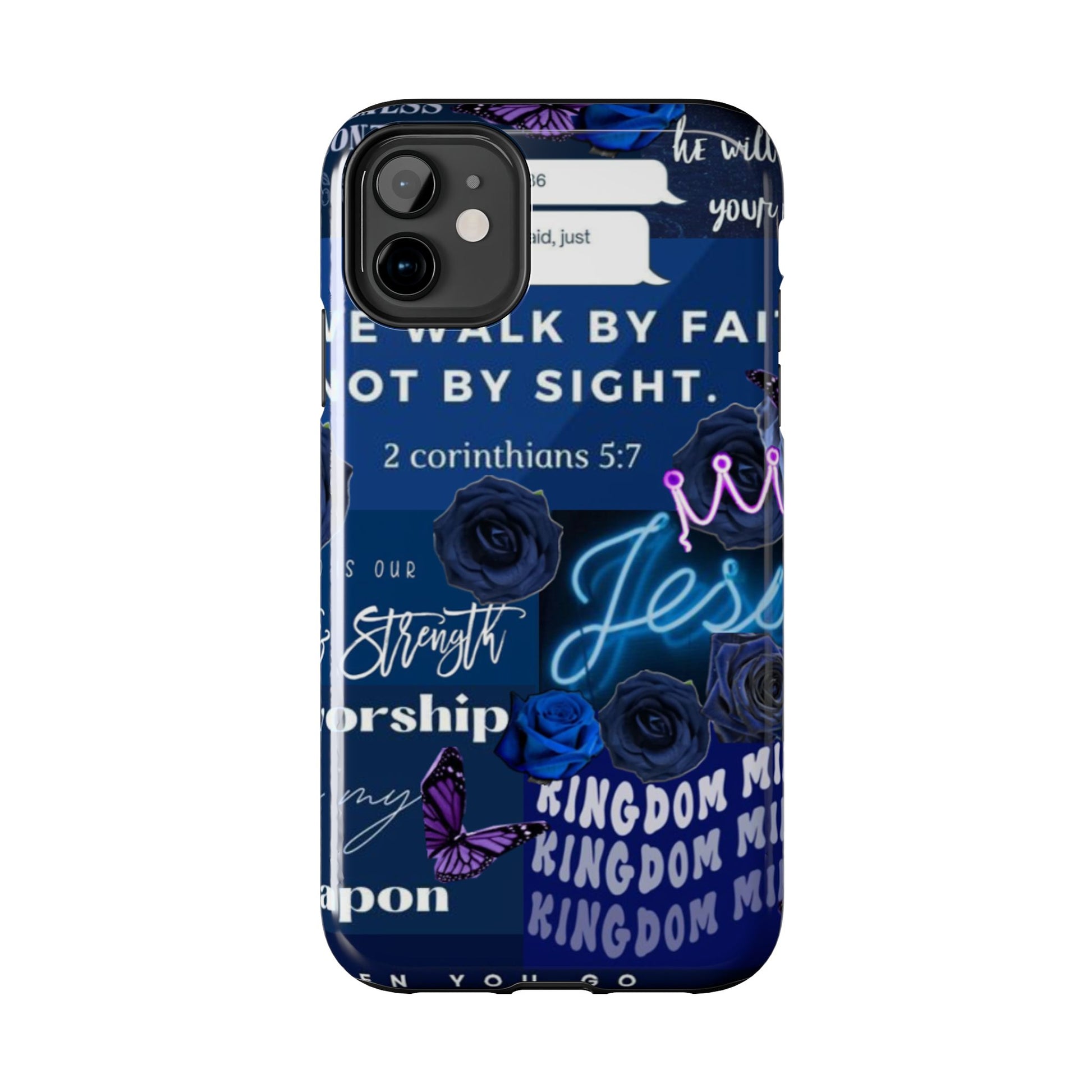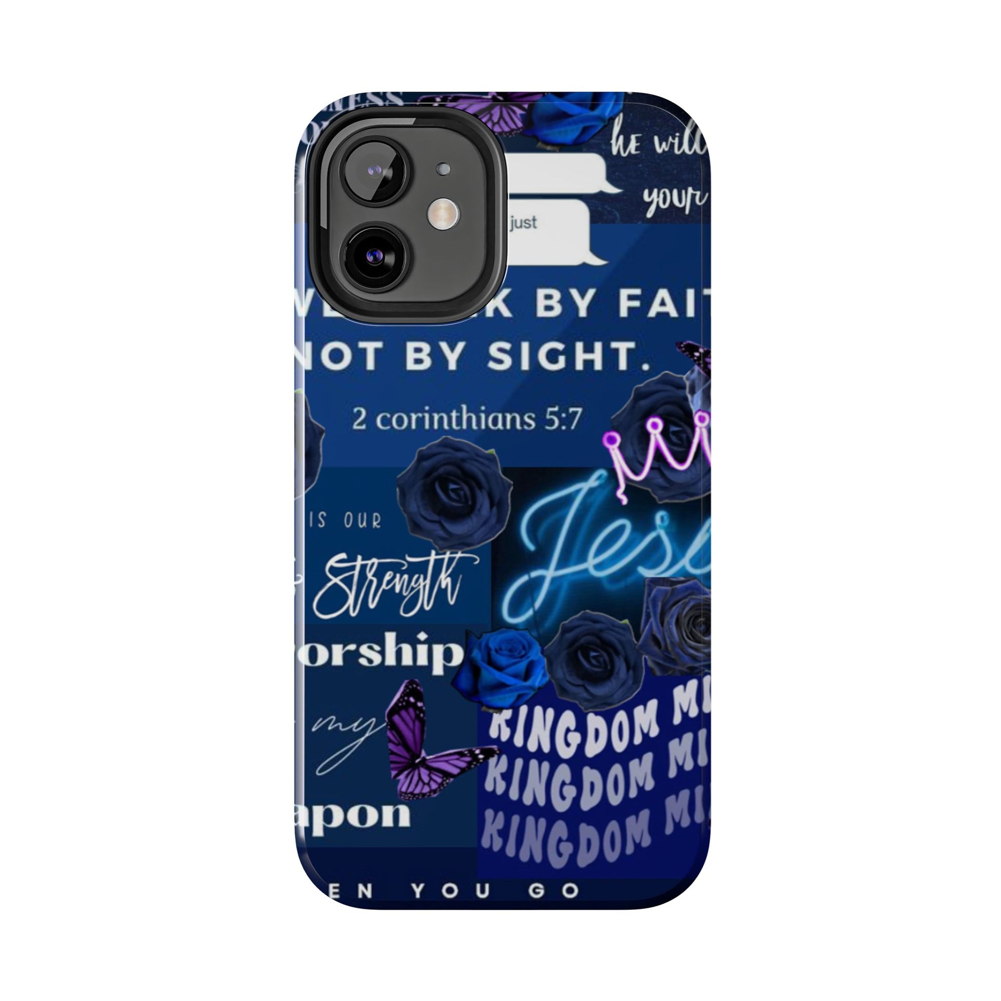 This phone case is for the Kingdom woman who fights her battles in worship and walks by faith, not by sight. Designed in rich navy blues with striking purple accents and royal roses, this collage style case features declarations like: