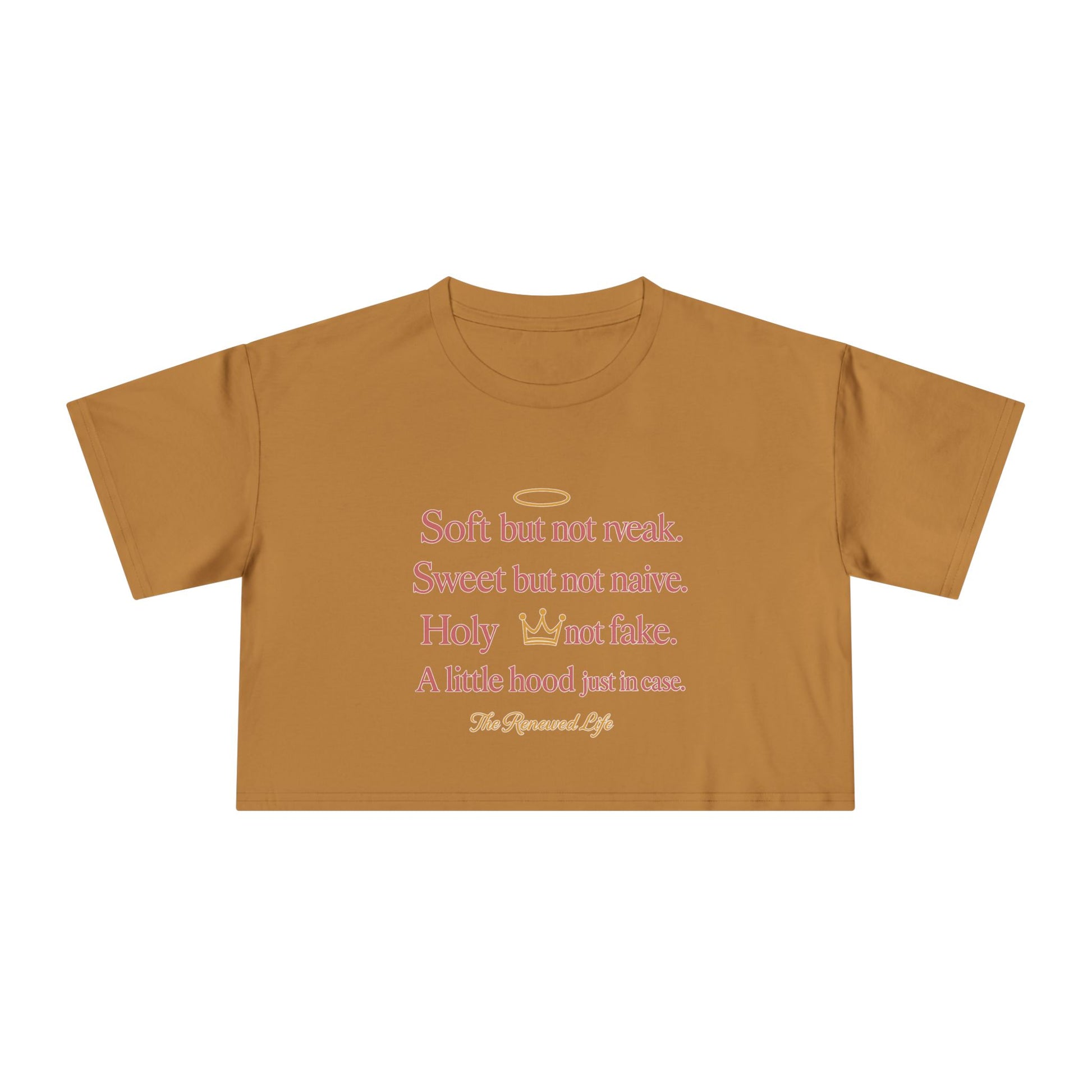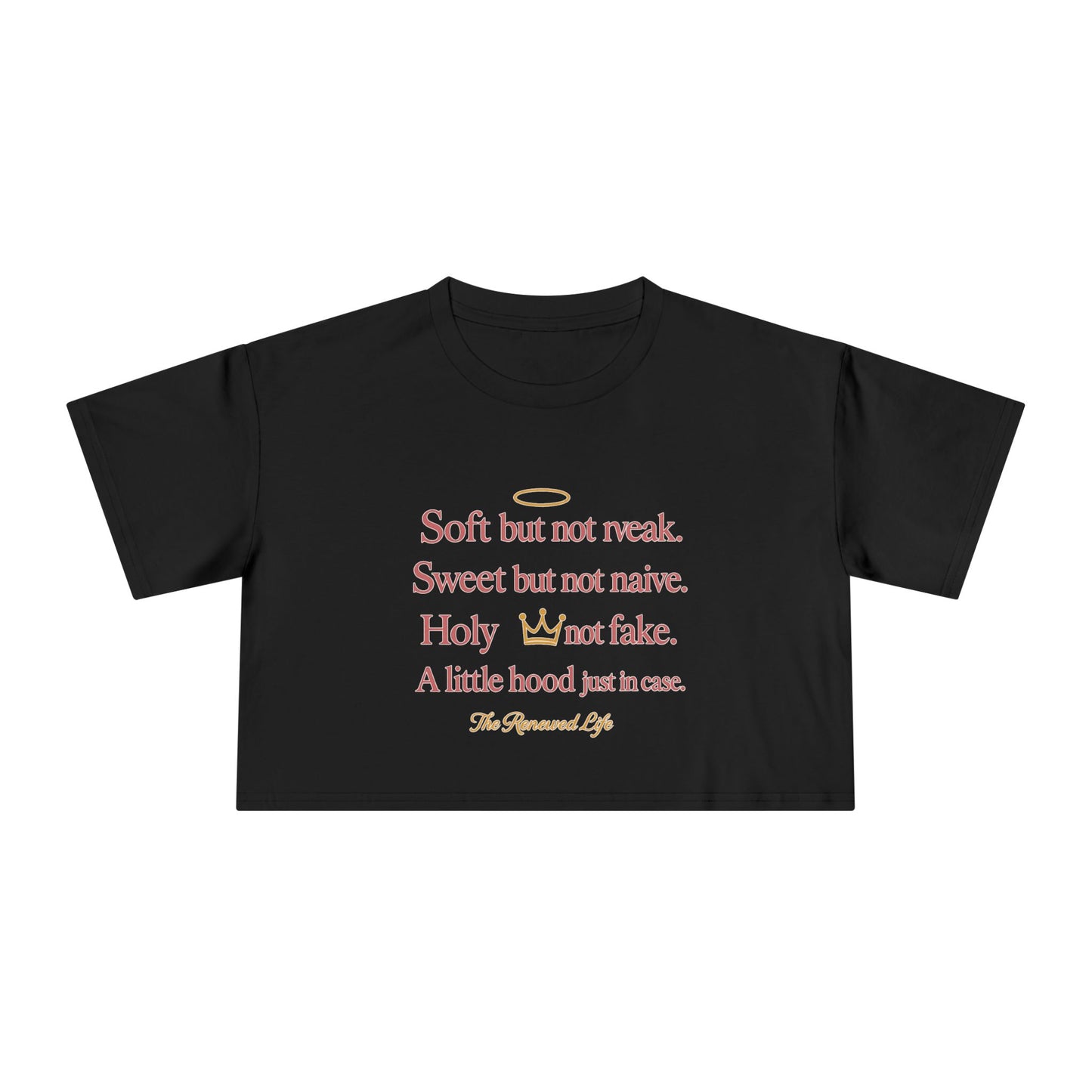 This one’s for the woman who’s balanced. The Holy, Sweet & A Little Hood Tee speaks to the soft yet strong, the sweet yet smart, the holy but not to be played with. Designed for women who walk with God but still know how to stand their ground, this crop-style tee gives faith, fashion, and attitude all in one.